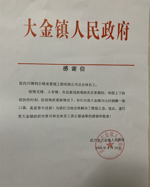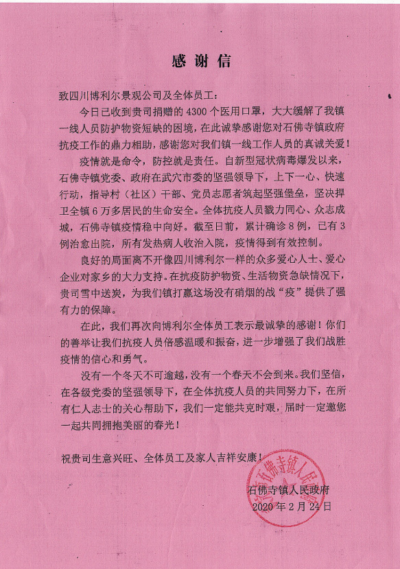 新型冠狀病毒爆發(fā)以來,博利爾公司及全體員工心系湖北。在全國防疫物資緊張的情況下,經(jīng)多方求購,我公司為湖北同胞籌措了8600個口罩,為受贈地一線人員解了燃眉之急,受到了當(dāng)?shù)卣腿嗣竦馁澴u!