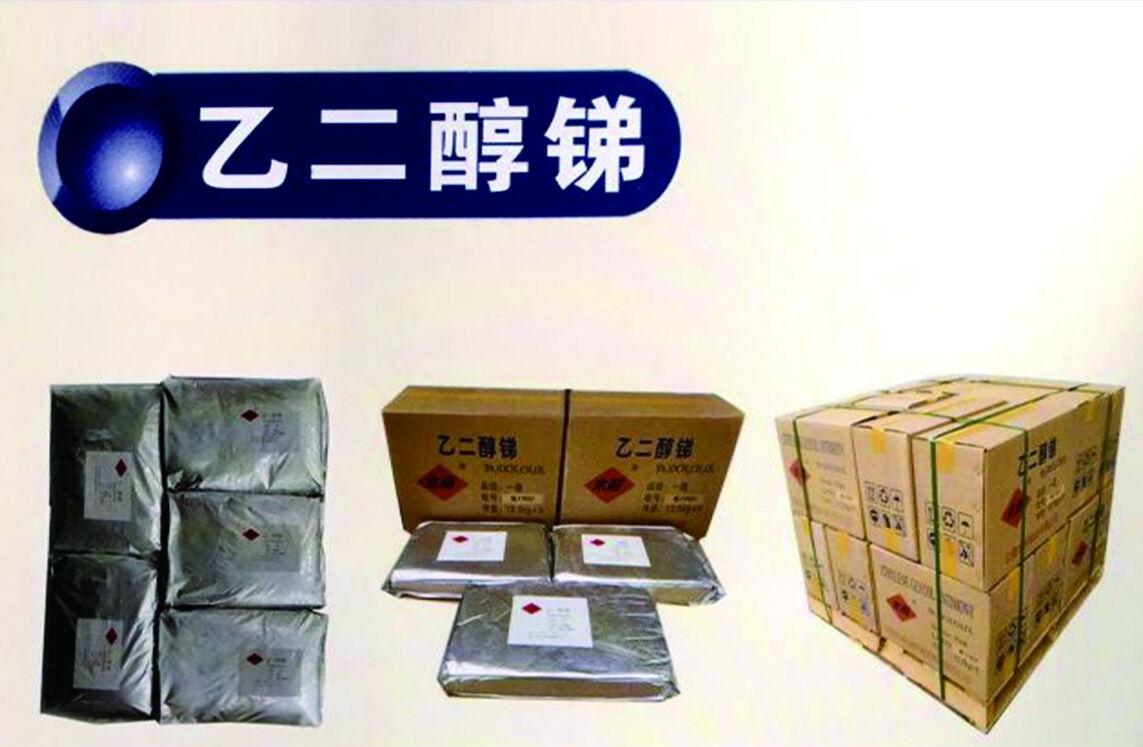 木利牌乙二醇銻產(chǎn)品使用本公司高純?nèi)趸R為主要原料,輔與優(yōu)質(zhì)乙二醇經(jīng)反應(yīng)、結(jié)晶、過濾、干燥等自動化工藝精制而成。乙二醇銻分子式: Sb2(OCH2CH2O)3, 分子量:423.66,乙二醇銻的外觀為白色或青白色結(jié)晶顆粒,無氣味,遇潮濕空氣易分解。